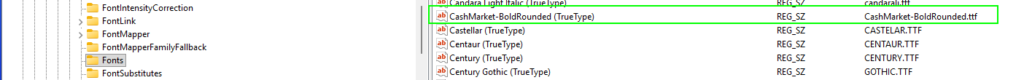 • The font has to be referenced in the registry path HKEY_LOCAL_MACHINE\SOFTWARE\Microsoft\Windows NT\CurrentVersion\Fonts in the format of FONTNAME (TrueType) for .ttf files and FONTNAME (OpenType) for .otf files.