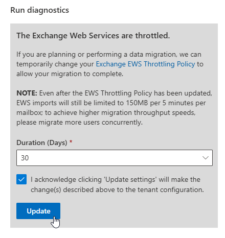 If the EWS is throttled you can choose to increase the policy for 30, 60 or 90 days.