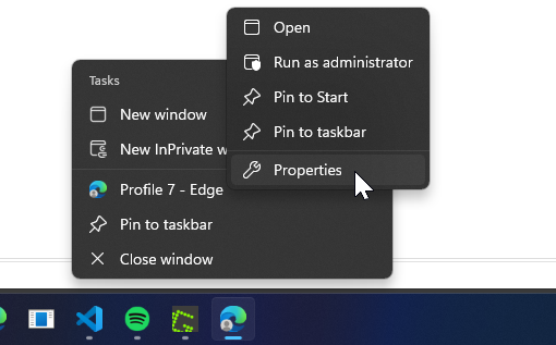 After that right the Edge icon in the taskbar again and then right click ‘Profile X – Edge’ and select Properties