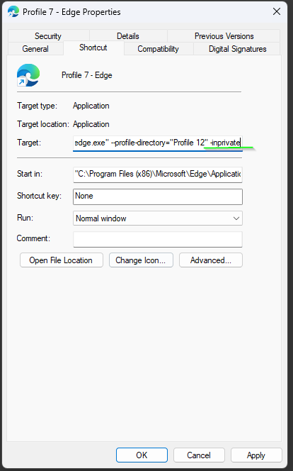In the Target field, scroll all the way to the end then make a space and add -inprivate like in the picture below. Hit Apply and OK.