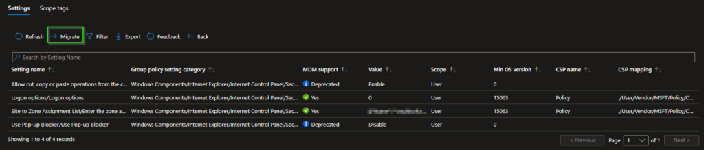 To migrate this GPO to an Intune policy we simply hit “Migrate” at the top.