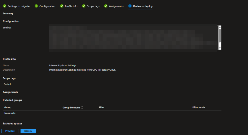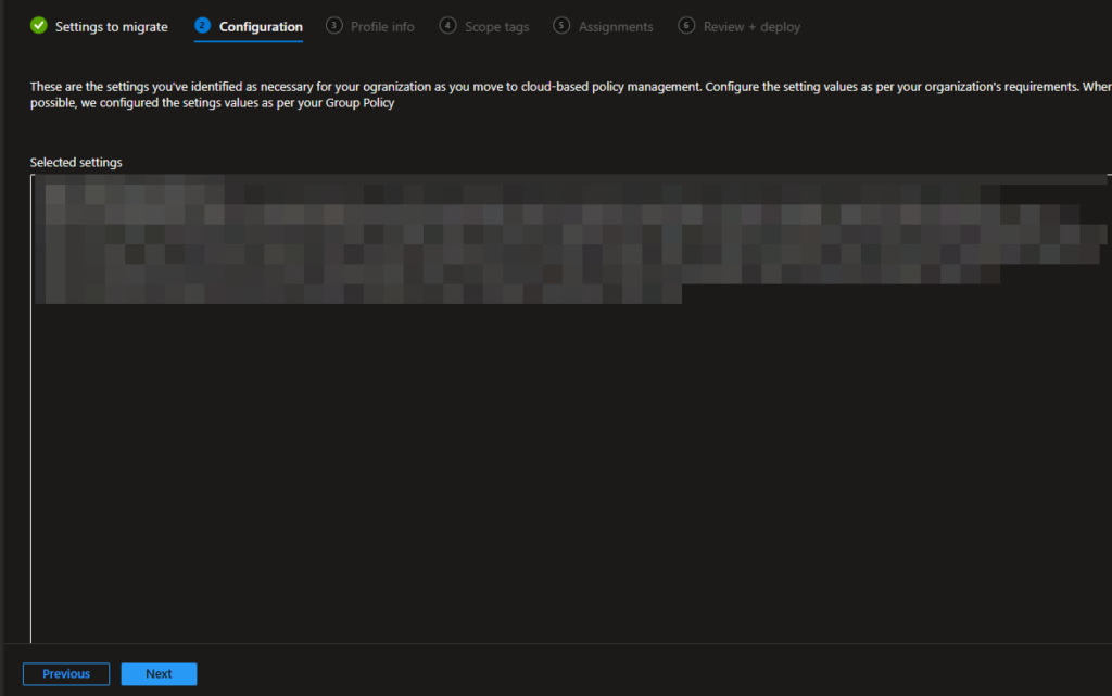 On the second page which is “Configuration” we can see which settings are actually in the GPO. Since my test GPO contains some sensitive information I had to blur it, but I think you get the point. Hit “Next” after reviewing your settings.