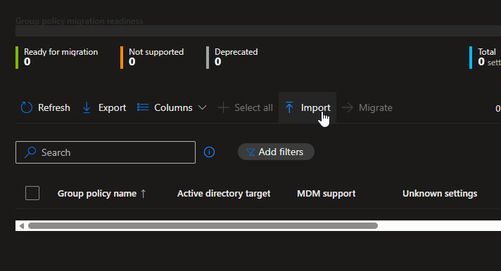 Go to Intune > Devices > Group Policy analytics and select “Import”. You can choose to upload one at a time or all reports at once. I will be doing all four of my GPOs