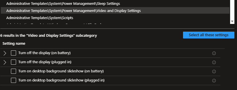 Power Settings – Power settings are available in Intune but sometimes the GPO might be set up so it doesn’t recognize the corresponding policy in Intune. Create a new settings catalog and you’ll find the settings under Adminstrative Templates\System\Power Management\Sleep Settings and Adminstrative Templates\System\Power Management\Video and Display Settings