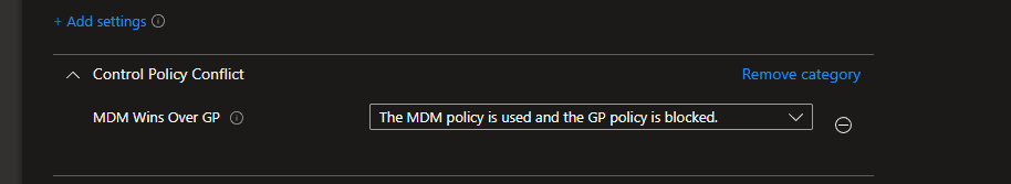 - If hybrid join is absolutely necessary, I would recommend just assigning the “new” apps and policies from Intune. If you have a policy in Intune that also exists in the AD, let the Intune do the job to get the device to a ‘mostly cloud’ managed state. There is a settings catalog policy to allow Intune policies to take precedence over GPOs (the opposite is default), which I recommend configuring in case of conflict. This makes it a bit easier to debug when shit hits the fan, since you know that Intune should always win if the settings are matching. Just search for MDM Wins and you’ll find it 👇