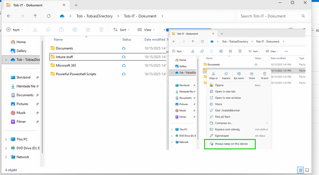 When going to the folder you can see it acts just as a regular OneDrive folder with Files On-Demand and the ability to keep files on your device if you like 👇