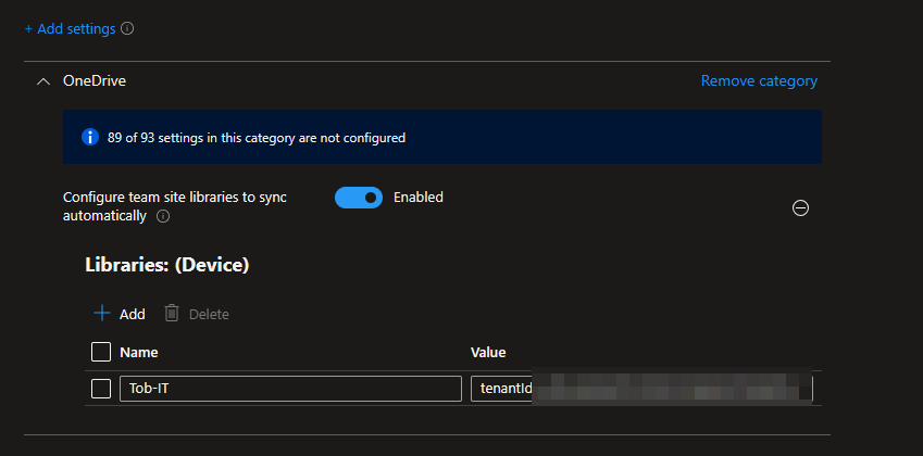 Next head over to Intune and create a settings catalog policy and search for the Configure team site libraries to sync automatically in the OneDrive category. Add a name and your library ID.